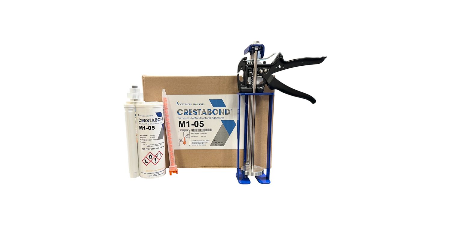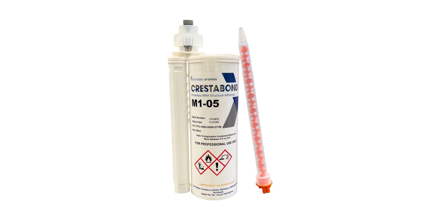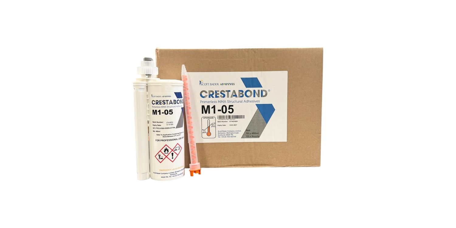Crestabond M1-05 Primerless MMA Structural Adhesive is a two-component, 10:1, fast setting and curing acrylic adhesive for bonding composites, thermoplastics and metals. Providing excellent strength, good impact and fatigue resistance and a primerless application, Crestabond M1-05 is ideal for demanding industrial jobs and doesn't need the addition of any extra materials or processes.